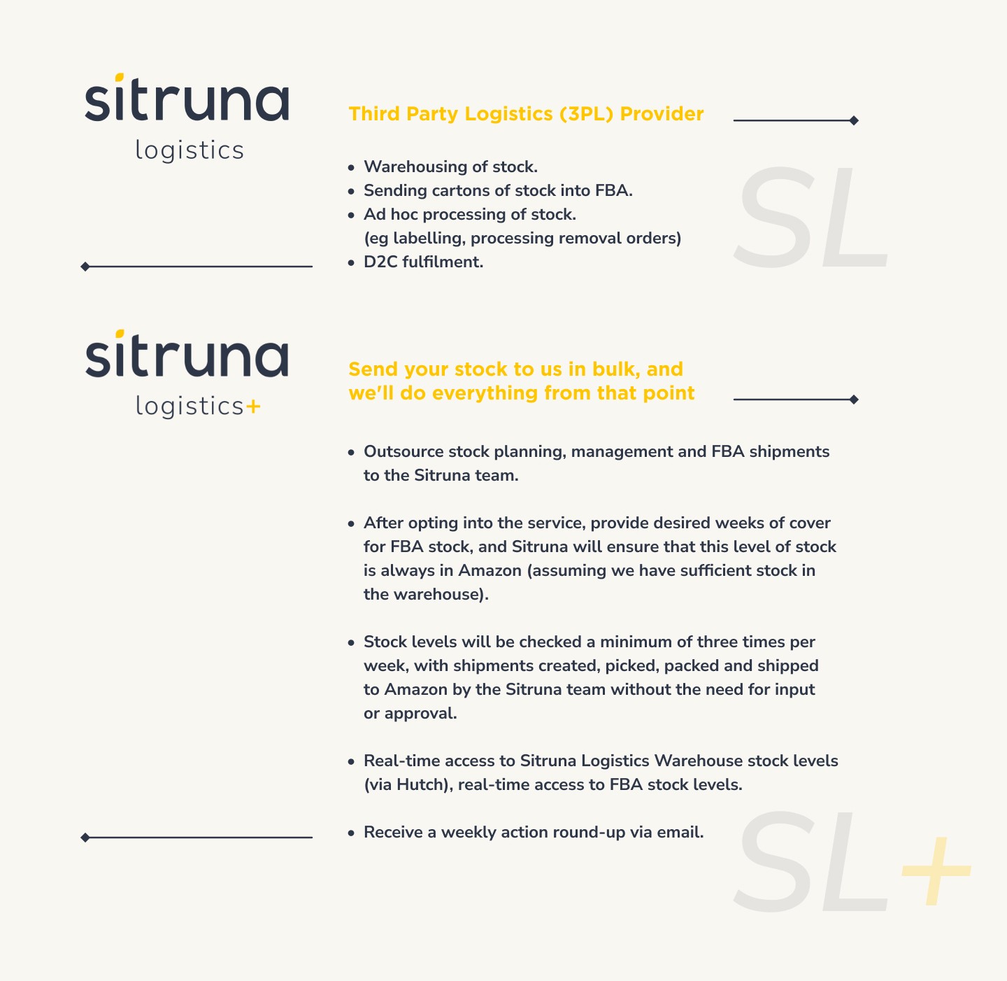Navigating the logistics landscape for your e-commerce business can be like deciphering a complex puzzle. But fear not! We’re here to help - let’s demystify the complexities of third-party logistics (3PL) with a spotlight on Amazon's 3PL services and Sitruna Logistics+. We'll explore how both services cater to the needs of businesses involved in Multi-Channel fulfilment.